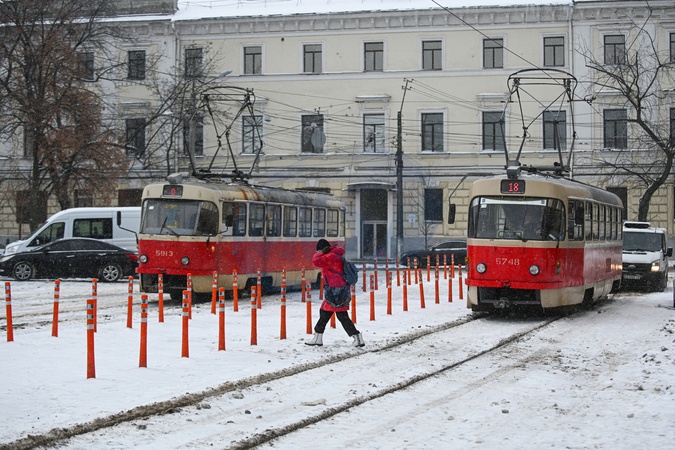 A woman crosses tracks between two trams in Kontraktova Square in the Podilskyi district in winter, Kyiv, Ukraine, January 9, 2026., Credit:EVGEN_KOTENKO / Avalon
