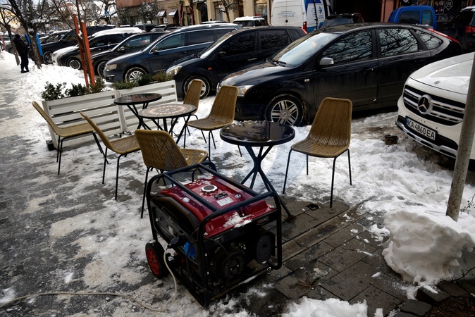 A generator is near the tables of an outdoor cafe in one of the central streets, Uzhhorod, Zakarpattia region, Ukraine, January 8, 2026., Credit:IGOR TKACHENKO / Avalon