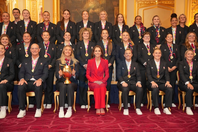 Britain's Kate, Princess of Wales, poses with members of the England Women's rugby team, at Windsor Castle, Windsor, England, Thursday, Jan. 15, 2026., Credit:Kin Cheung / Avalon