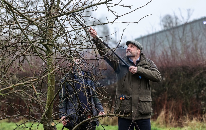 The Prince of Wales helps prune the trees in an apple orchard as he visits a family run farm by John and Laura Bowler in Herefordshire as patron of "We Are Farming Minds” a Herefordshire based charity which is committed to supporting farmers and promoting good mental health among the farming community across the UK., Credit:RICHARD POHLE / Avalon