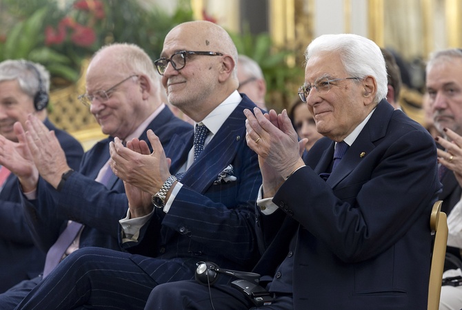 President Sergio Mattarella, alongside Inigo Lambertini, Italian Ambassador to London, and Robert Fox, Dean of British Journalists, at the meeting with participants in the 30th anniversary of the Venice Seminar for the British Press. Rome, Italy 15 January 2026, Credit:Paul Giandotti / Avalon