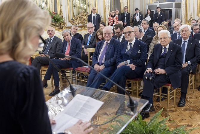 President Sergio Mattarella, alongside Inigo Lambertini, Italian Ambassador to London, and Robert Fox, Dean of British Journalists, at the meeting with participants in the 30th anniversary of the Venice Seminar for the British Press. Rome, Italy 15 January 2026, Credit:Paul Giandotti / Avalon
