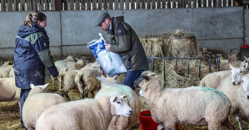 The Prince of Wales feeds sheep in a shed on a family farm run by John and Laura Bowler in Herefordshire as patron of "We Are Farming Minds” a Herefordshire based charity which is committed to supporting farmers and promoting good mental health among the farming community across the UK., Credit:RICHARD POHLE / Avalon