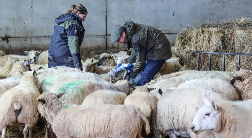 The Prince of Wales feeds sheep in a shed on a family farm run by John and Laura Bowler in Herefordshire as patron of "We Are Farming Minds” a Herefordshire based charity which is committed to supporting farmers and promoting good mental health among the farming community across the UK., Credit:RICHARD POHLE / Avalon