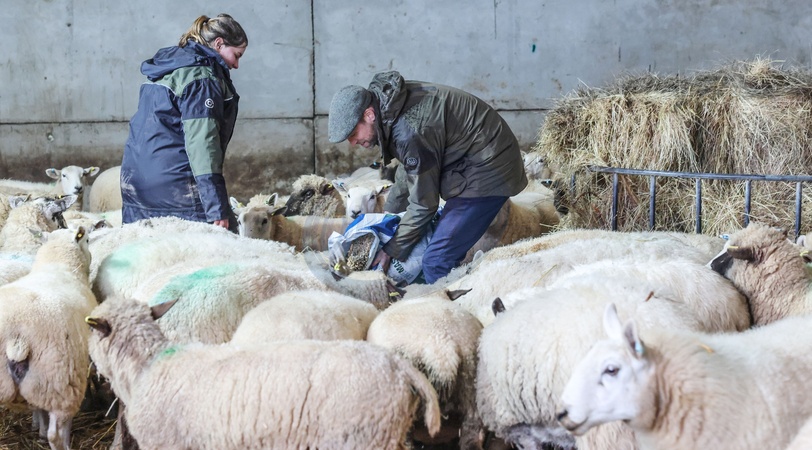 The Prince of Wales feeds sheep in a shed on a family farm run by John and Laura Bowler in Herefordshire as patron of "We Are Farming Minds” a Herefordshire based charity which is committed to supporting farmers and promoting good mental health among the farming community across the UK., Credit:RICHARD POHLE / Avalon