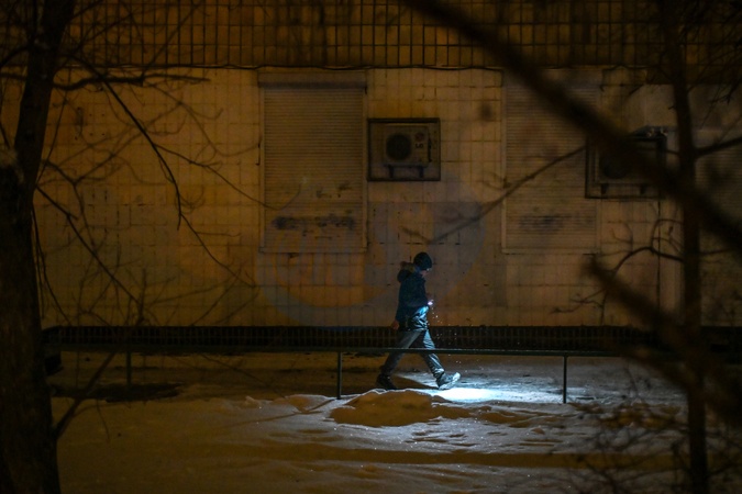 A man lights his way with a flashlight while walking in the dark in Kyiv, Ukraine, on January 14, 2026. The city continues to face emergency power outages after Russian attacks damaged energy infrastructure, with outages lasting around 10 hours and power supply restored for about three hours, Credit:Yevhen Kotenko / Avalon