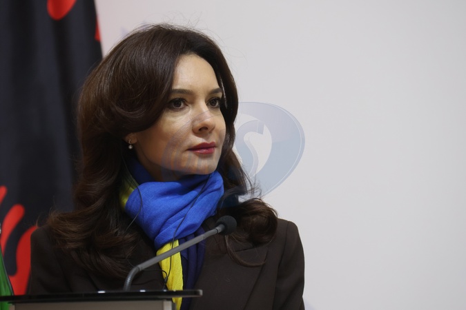 Minister of Foreign Affairs of Albania Elisa Spiropali is seen during a joint press conference with her Ukrainian counterpart Andrii Sybiha following talks on bilateral relations, international cooperation, and a shared path toward EU accession in Kyiv, Ukraine, on January 15, 2026, Credit:Pavlo Bahmut / Avalon