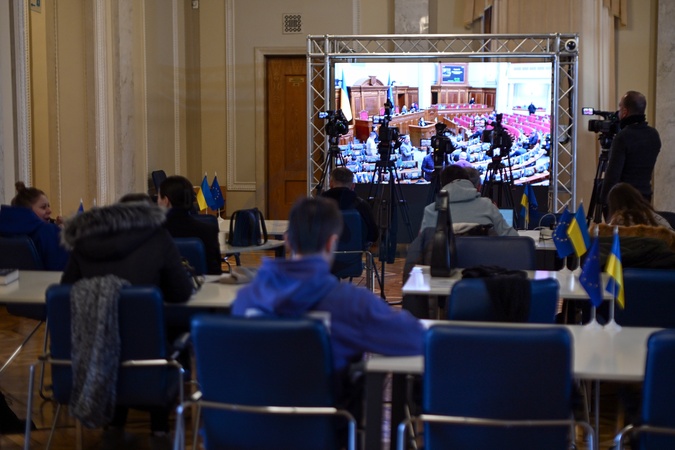 Journalists work at the parliament press center as a regular plenary session of the Verkhovna Rada of Ukraine is broadcast on a screen in Kyiv, Ukraine, on January 15, 2026, Credit:Yevhen Kotenko / Avalon