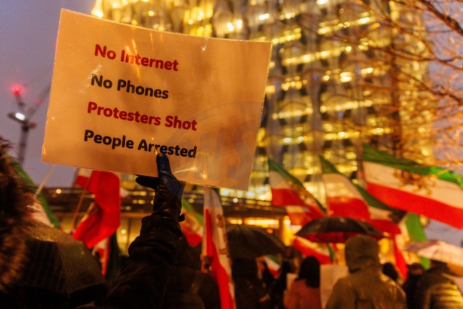 US Embassy, London, UK. 15th January 2026.An emotional crowd gather in front of the American Embassy in London calling for US President Trump to keep his promise to support Iranians in Iran amid reports of mass killings of protesters, despite the communication blackout since the Government cut internet services and phone lines in Iran on the 8th January., Credit:Photo by Amanda Rose / Avalon