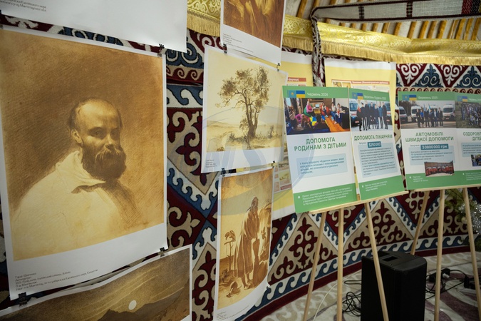 Paintings and information stands are displayed inside the "Yurta of Resilience” during the presentation of the report by the Verkhovna Rada parliamentary group for interparliamentary relations with the Republic of Kazakhstan in Kyiv, Ukraine, on January 14, 2026. The event marked the third anniversary of the "Yurta of Resilience” initiative supporting Ukrainians during blackouts, launched jointly with Kazakh benefactors and volunteers of the Kazakh diaspora in Ukraine, Credit:Danylo Antoniuk / Avalon