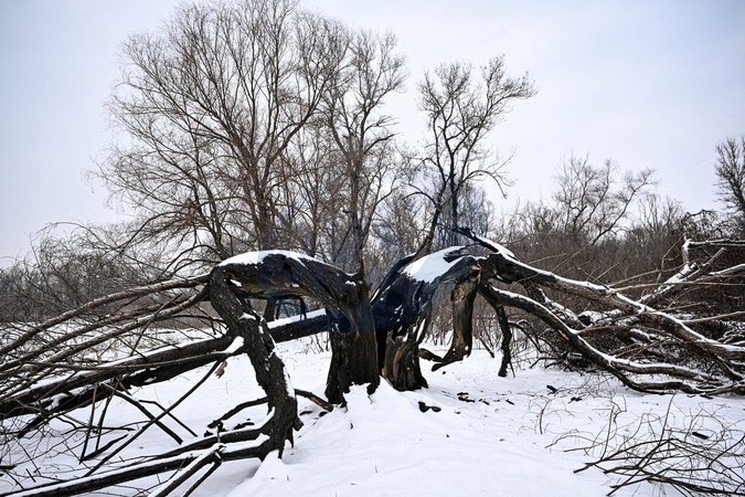 A winter scene shows a broken tree on Khortytsia Island, Zaporizhzhia, Ukraine, on January 13, 2026, Credit:Dmytro Smolienko / Avalon