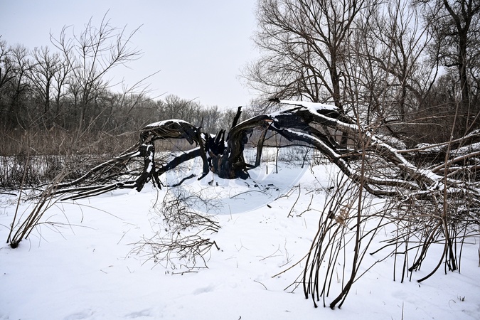 A winter scene shows a broken tree on Khortytsia Island, Zaporizhzhia, Ukraine, on January 13, 2026, Credit:Dmytro Smolienko / Avalon