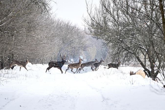 A herd of spotted deer runs across a road on Khortytsia Island in Zaporizhzhia, on January 13, 2026, Credit:Dmytro Smolienko / Avalon