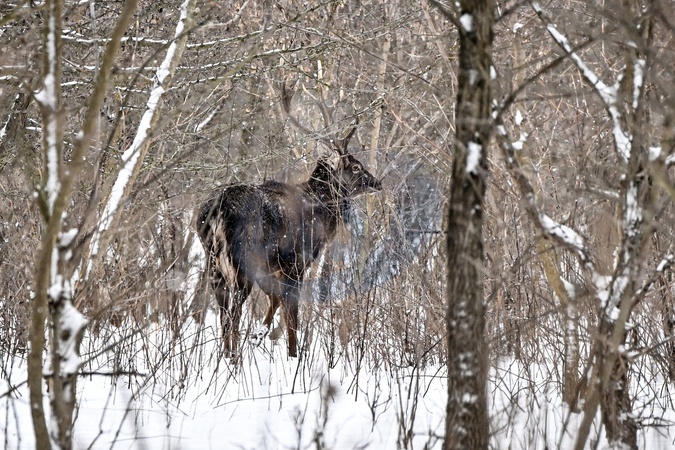A spotted deer grazes among shrubs on Khortytsia Island in Zaporizhzhia, on January 13, 2026, Credit:Dmytro Smolienko / Avalon