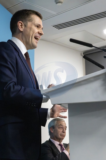 London, UK. 15th January 2026. Shadow justice secretary Robert Jenrick, pictured alongside Nigel Farage MP, formally joined Reform UK during a press conference held at the party's headquarters on Millbank, London. The announcement followed Jenrick's dismissal by Conservative Party leader Kemi Badenoch, who accused him of "plotting to defect in a way designed to be as damaging as possible” to her party., Credit:Abdullah Bailey / Avalon