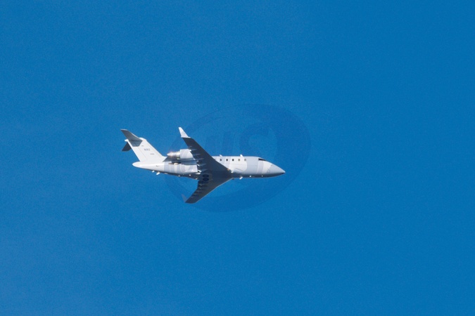 A low flying jet, a Bombardier CL600 believed to be used by the Federal Aviation Administration to monitor and calibrate navigational aids at the two nearby USAF airbases in Mildenhall and Lakenheath. Ely. Cambridgeshire, UK.