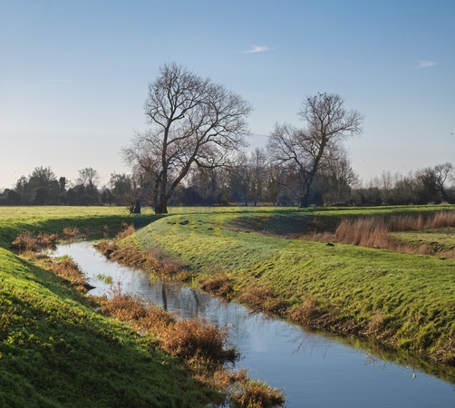 Fenland landscape by a lode (stream or river) which allows drainage on the rich soils in the Fens of East Anglia.