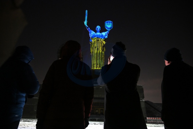 Motherland Monument lit in colors of Ukrainian and British flags