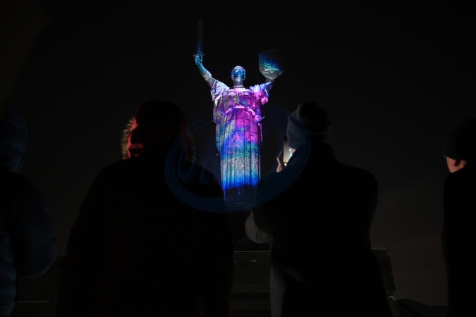 The Motherland Monument is illuminated with the flags of the United Kingdom and Ukraine and the Century Partnership logo during a symbolic light display held to mark the anniversary of the signing of the Century Partnership Agreement between Ukraine and the United Kingdom, Kyiv, Ukraine, on January 15, 2026. The Century Partnership logo symbolizes unity through national flowers: sunflower for Ukraine, rose for England, daffodil for Wales, thistle for Scotland, and flax for Northern Ireland, Credit:Yevhen Kotenko / Avalon