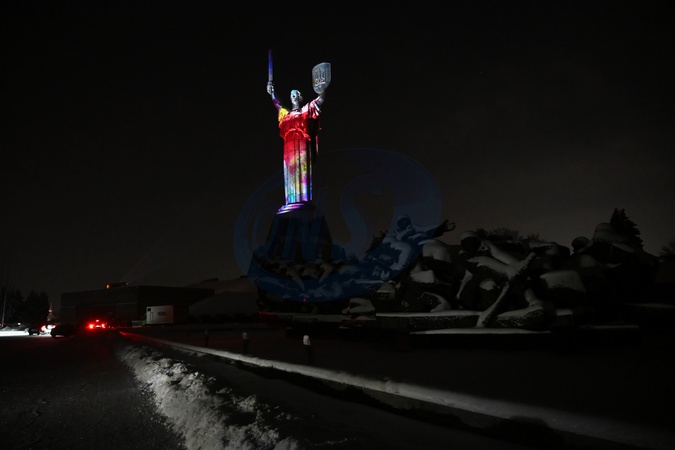 Motherland Monument lit in colors of Ukrainian and British flags
