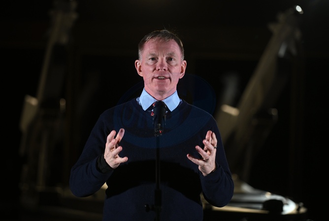 British Labour Party politician Chris Bryant delivers a speech during a symbolic light show in which the Motherland Monument is illuminated with the flags of the United Kingdom and Ukraine, as well as the logo of the Century Partnership, marking the anniversary of the signing of the Century Partnership Agreement between Ukraine and the United Kingdom, Kyiv, Ukraine, on January 15, 2026. The Century Partnership logo symbolizes unity: the sunflower represents Ukraine, the rose England, the daffodil Wales, the thistle Scotland, and flax Northern Ireland, Credit:Yevhen Kotenko / Avalon