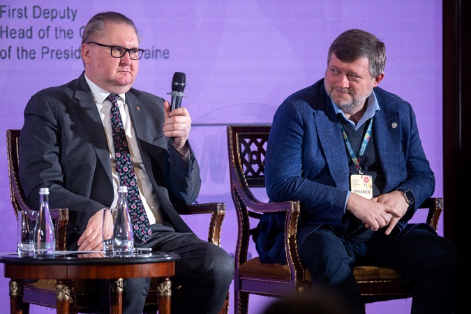 Deputy Prime Minister for European and Euro-Atlantic Integration of Ukraine Taras Kachka (L) and First Deputy Speaker of the Ukrainian Parliament Oleksandr Korniienko participate in the UK-Ukraine: 100 Year Partnership Forum to mark the first anniversary of the One Hundred Year Partnership Agreement between the United Kingdom of Great Britain and Northern Ireland and Ukraine, Kyiv, Ukraine, on January 16, 2026., Credit:Danylo Antoniuk / Avalon
