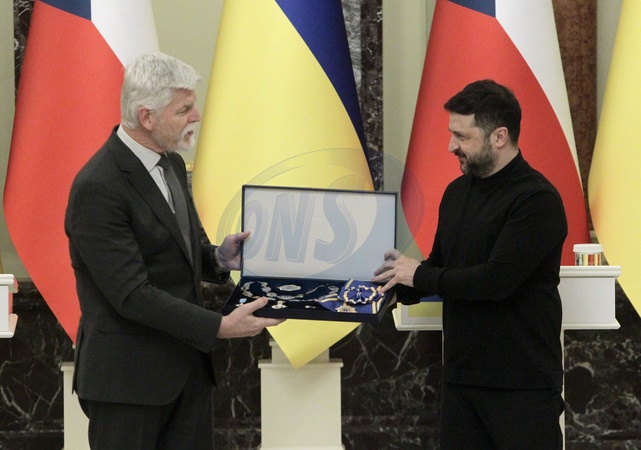 President of Ukraine Volodymyr Zelenskyy (R) awards the Order of Prince Yaroslav the Wise to President of the Czech Republic Petr Pavel during a joint news conference at the Mariinskyi Palace, Kyiv, Ukraine, on January 16, 2026., Credit:Hennadii Minchenko / Avalon