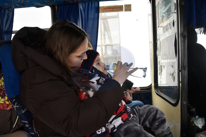 A woman gives water to a child on a bus for evacuees from frontline communities who arrived in Mukachevo by evacuation train at the Mukachevo railway station, Mukachevo, Zakarpattia Region, on January 15, 2026. The train brought families from Zaporizhzhia Region, with a total of 39 evacuees, including 20 children. The youngest passengers were two infants born in 2025, Credit:Yulii Zozulia / Avalon