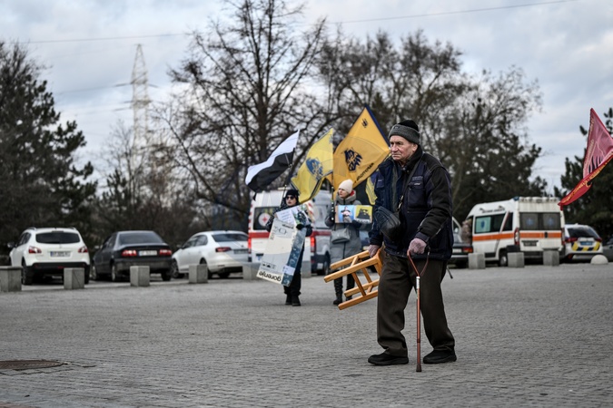 An elderly man with a cane carries a stool as he joins the "Don't Be Silent! Captivity Kills!" rally to remind people about the prisoners of war from the Mariupol garrison, captive and missing defenders of Ukraine in Zaporizhzhia, Ukraine, January 10, 2026., Credit:Dmytro Smolienko / Avalon