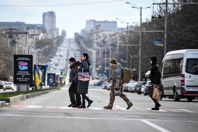 A soldier with a backpack and other pedestrians cross a street in Zaporizhzhia, Ukraine, January 10, 2026., Credit:Dmytro Smolienko / Avalon