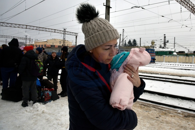A woman who arrived from a frontline area by evacuation train holds an infant at the Mukachevo railway station, Mukachevo, Zakarpattia Region, on January 15, 2026. The train brought families from Zaporizhzhia Region, with a total of 39 evacuees, including 20 children. The youngest passengers were two infants born in 2025, Credit:Yulii Zozulia / Avalon