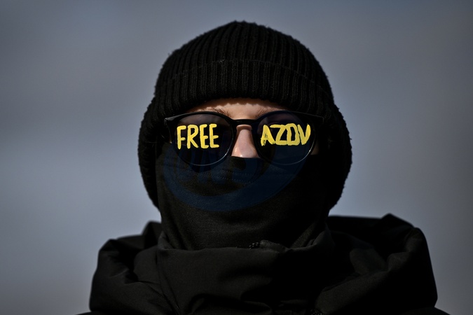 An activist in a black hat and a black face covering wears sunglasses featuring the "Free Azov" slogan during the "Don't Be Silent! Captivity Kills!" rally to remind people about the prisoners of war from the Mariupol garrison, captive and missing defenders of Ukraine in Zaporizhzhia, Ukraine, January 10, 2026., Credit:Dmytro Smolienko / Avalon
