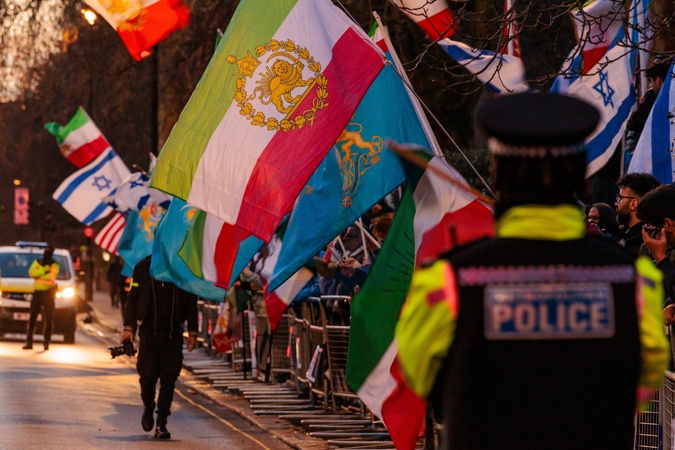 Iranian Embassy, London, UK. 16th January 2026.Metropolitan Police officers stand guard outside the Embassy of the Islamic Republic of Iran keeping a watchful eye on protesters who continue to gather outside the Embassy in a show of solidarity for the protesters in Iran and to demand help as they enter a second week without contact with their loved ones following the nationwide blackout which started on Jan 8th., Credit:Photo by Amanda Rose / Avalon