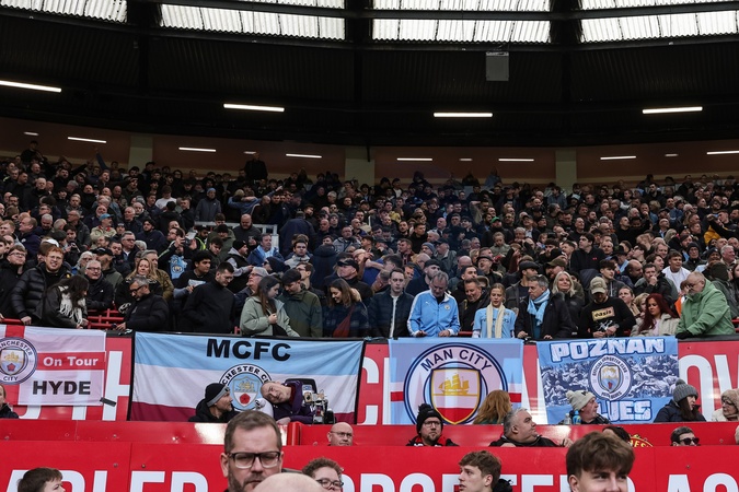 City fans placer their flags over the parapet wall during the Premier League match Manchester United vs Manchester City at Old Trafford, Manchester, United Kingdom, 17th January 2026, Credit:Mark Cosgrove/News Images / Avalon
