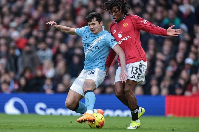 Abdukodir Khusanov of Manchester City holds off Patrick Dorgu of Manchester United during the Premier League match Manchester United vs Manchester City at Old Trafford, Manchester, United Kingdom, 17th January 2026, Credit:Mark Cosgrove/News Images / Avalon