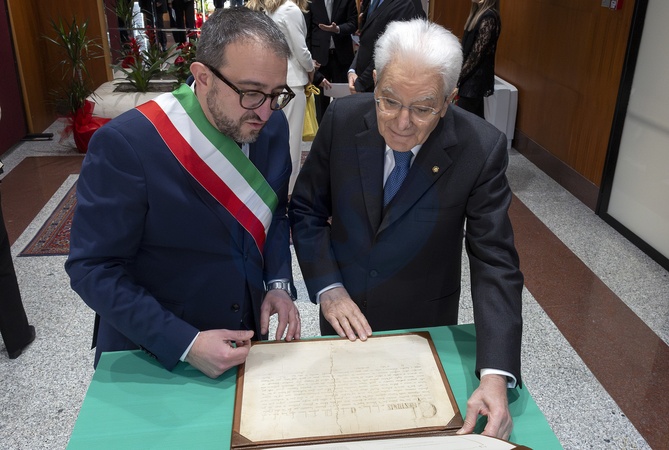 President of the Republic Sergio Mattarella receives from Pierluigi Biondi, Mayor of L'Aquila, an anastatic copy of the Papal Bull of Pardon of Celestine V, on the occasion of the inauguration ceremony of L'Aquila, Italian Capital of Culture 2026. L'Aquila, Italy 17 January 2026, Credit:Paul Giandotti / Avalon