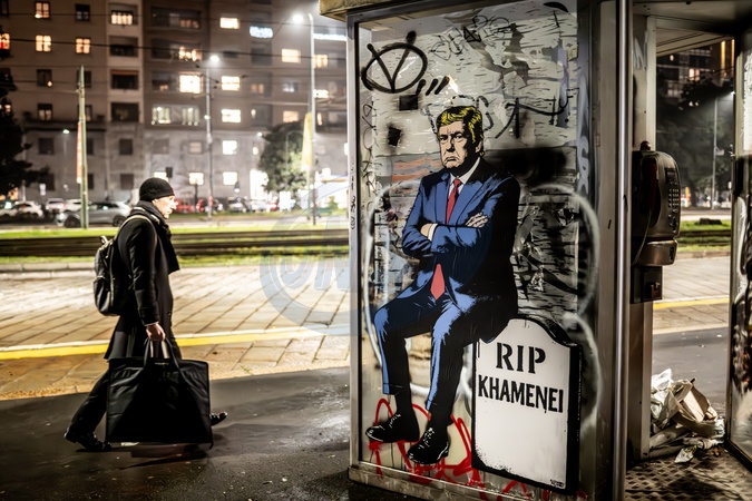 Republic Square, a new work by aleXsandro Palombo, near the U.S. Consulate General, titled MIGA – Make Iran Great Again. The mural depicts Donald Trump sitting on a tombstone with the inscription "Rip Khamenei," a gesture of support for the uprisings in Iran, amid widespread protests and numerous civilian casualties linked to the repression of the regime led by Ayatollah Ali Khamenei. Milan, Italy 16 January 2026, Credit:Nicola Marfisi / Avalon