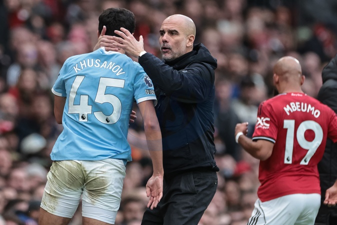 Pep Guardiola manager of Manchester City embraces Abdukodir Khusanov of Manchester City after winning the ball during the Premier League match Manchester United vs Manchester City at Old Trafford, Manchester, United Kingdom, 17th January 2026, Credit:Mark Cosgrove/News Images / Avalon