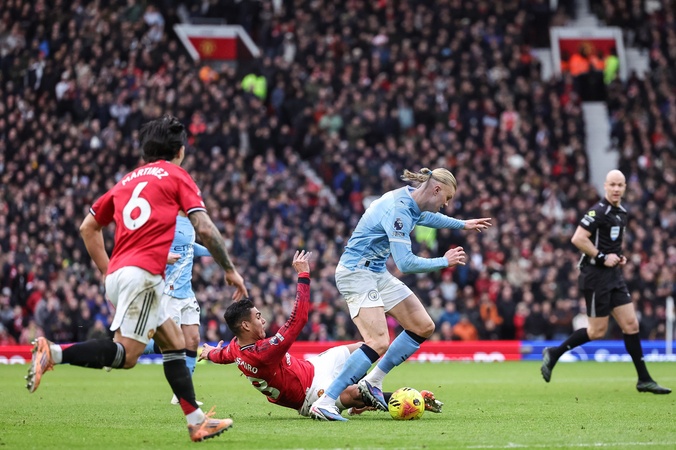 Casemiro of Manchester United slide tackles Erling Haaland of Manchester City during the Premier League match Manchester United vs Manchester City at Old Trafford, Manchester, United Kingdom, 17th January 2026, Credit:Mark Cosgrove/News Images / Avalon