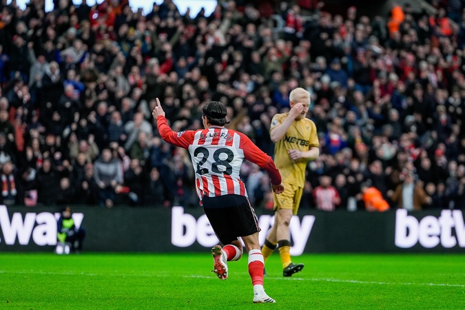 Enzo Le Fee of Sunderland celebrates his goal to make it 1-1 during the Premier League match Sunderland vs Crystal Palace at Stadium Of Light, Sunderland, United Kingdom, 17th January 2026, Credit:Maynard Manyowa/News Images / Avalon