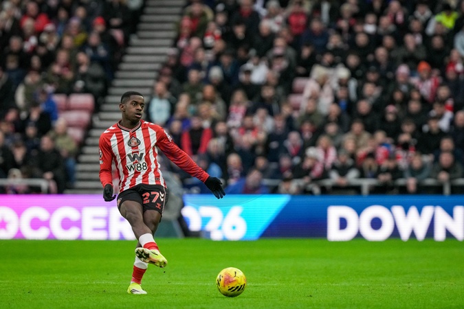 Noah Sadiki of Sunderland passes the ball during the Premier League match Sunderland vs Crystal Palace at Stadium Of Light, Sunderland, United Kingdom, 17th January 2026, Credit:Maynard Manyowa/News Images / Avalon
