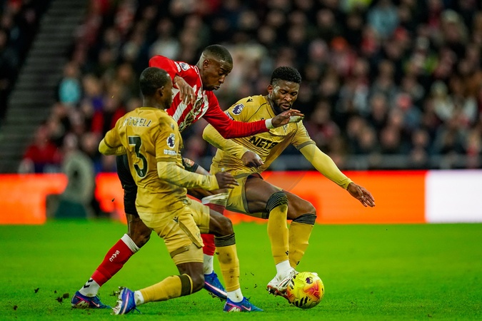 Nordi Mukiele of Sunderland is tacked by Tyrick Mitchell of Crystal Palace during the Premier League match Sunderland vs Crystal Palace at Stadium Of Light, Sunderland, United Kingdom, 17th January 2026, Credit:Maynard Manyowa/News Images / Avalon