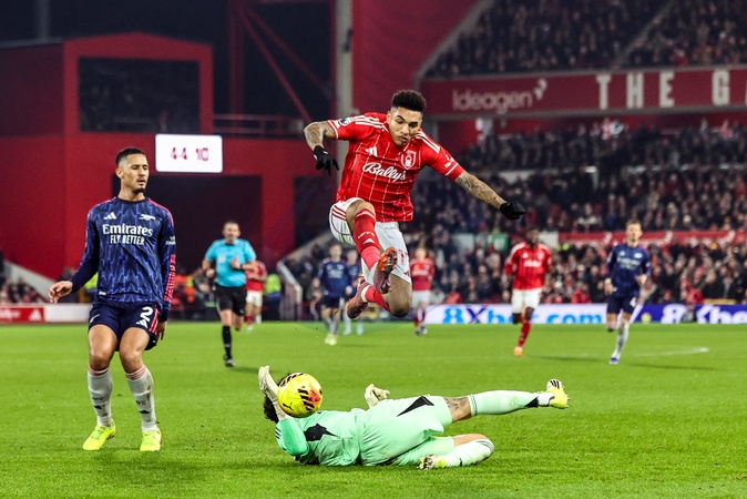 Igor Jesus of Nottingham Forest breaks past Arsenal goalkeeper David Raya during the Premier League match Nottingham Forest vs Arsenal at City Ground, Nottingham, United Kingdom, 17th January 2026, Credit:Ae Cosgrove/News Images / Avalon