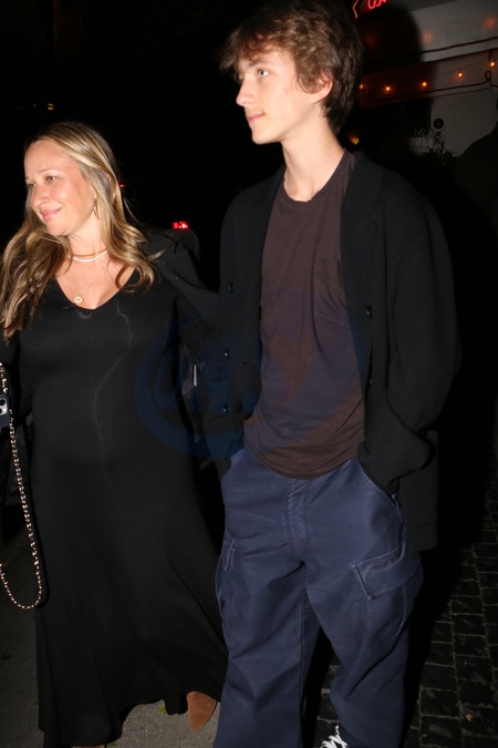 Jennifer Meyer, pregnant at 48, and her son Otis leave Chateau Marmont, Los Angeles, USA, 16 January 2026., Credit:MHD / Avalon
