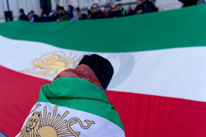Around 1200 protested met at Trafalgar Square in front of the National Gallery and then marched to the Iranian embassy., Credit:Aldo Ciarrocchi / Avalon