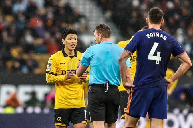 Hwang Hee-Chan of Wolverhampton Wanderers appeals to referee Samuel Barrott during the Premier League match Wolverhampton Wanderers vs Newcastle United at Molineux, Wolverhampton, United Kingdom, 18th January 2026, Credit:Ae Cosgrove/News Images / Avalon