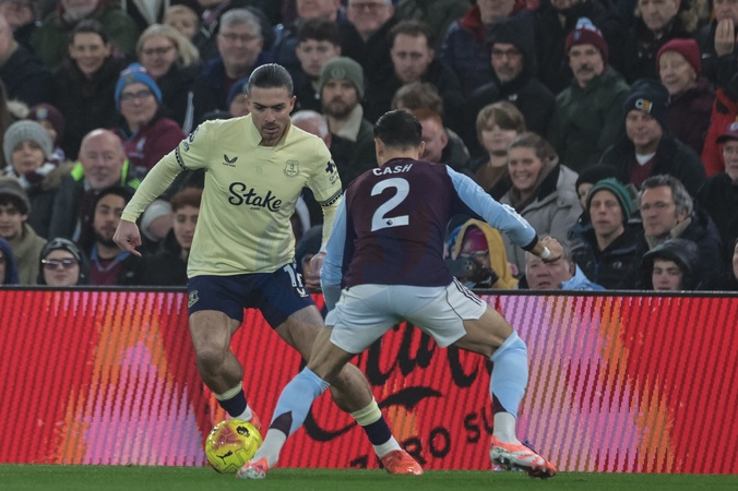 Jack Grealish of Everton holds the ball as Matty Cash of Aston Villa pressures during the Premier League match Aston Villa vs Everton at Villa Park, Birmingham, United Kingdom, 18th January 2026, Credit:Mark Cosgrove/News Images / Avalon