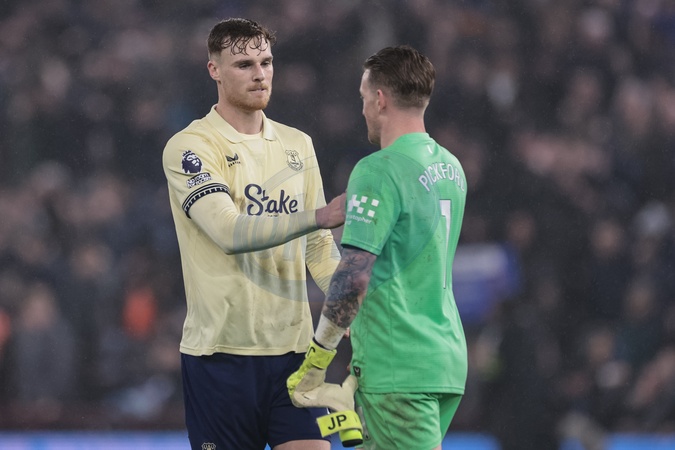 Jake O'Brien of Everton shakes hands with Everton goalkeeper Jordan Pickford during the Premier League match Aston Villa vs Everton at Villa Park, Birmingham, United Kingdom, 18th January 2026, Credit:Mark Cosgrove/News Images / Avalon