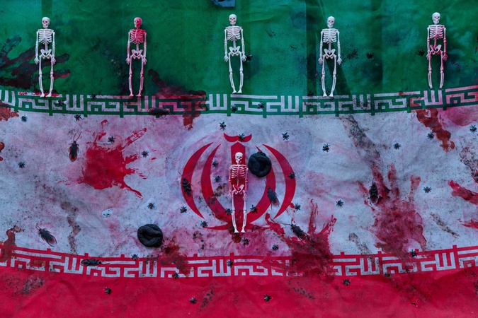 Iranian Embassy, London, UK. 18th January 2026.Thousands of Iranians continue to gather in front of the Embassy of the Islamic Republic of Iran, in protest of the reported violence, mass killings and arrests of the protesters in Iran and show support for the return of Crown Prince Reza Pahlavi.The Islamic Republic 'crab' flag, splattered with fake blood and skeletons, representing the murders committed by the regime., Credit:Photo by Amanda Rose / Avalon