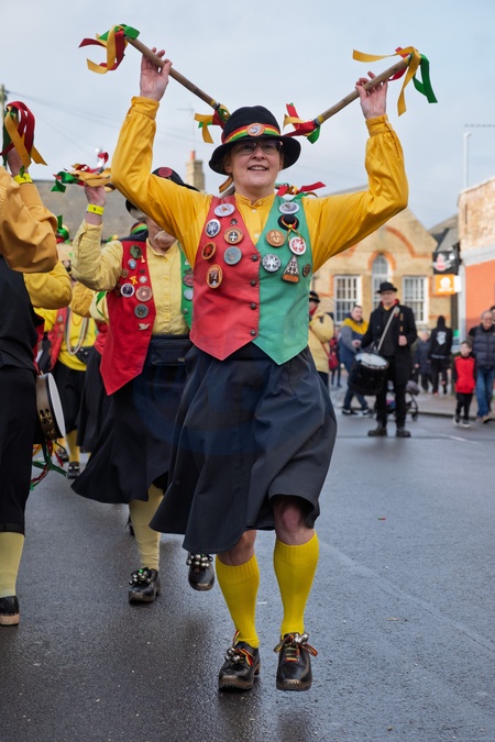 morris dancers at Whittlesea straw bear festival,held every January in the little town of Whittlesey / Whittlesea in Cambridgeshire, near Peterborough, UK. Here a straw bear parades and dances through the streets along with various Molly / Morris dancers